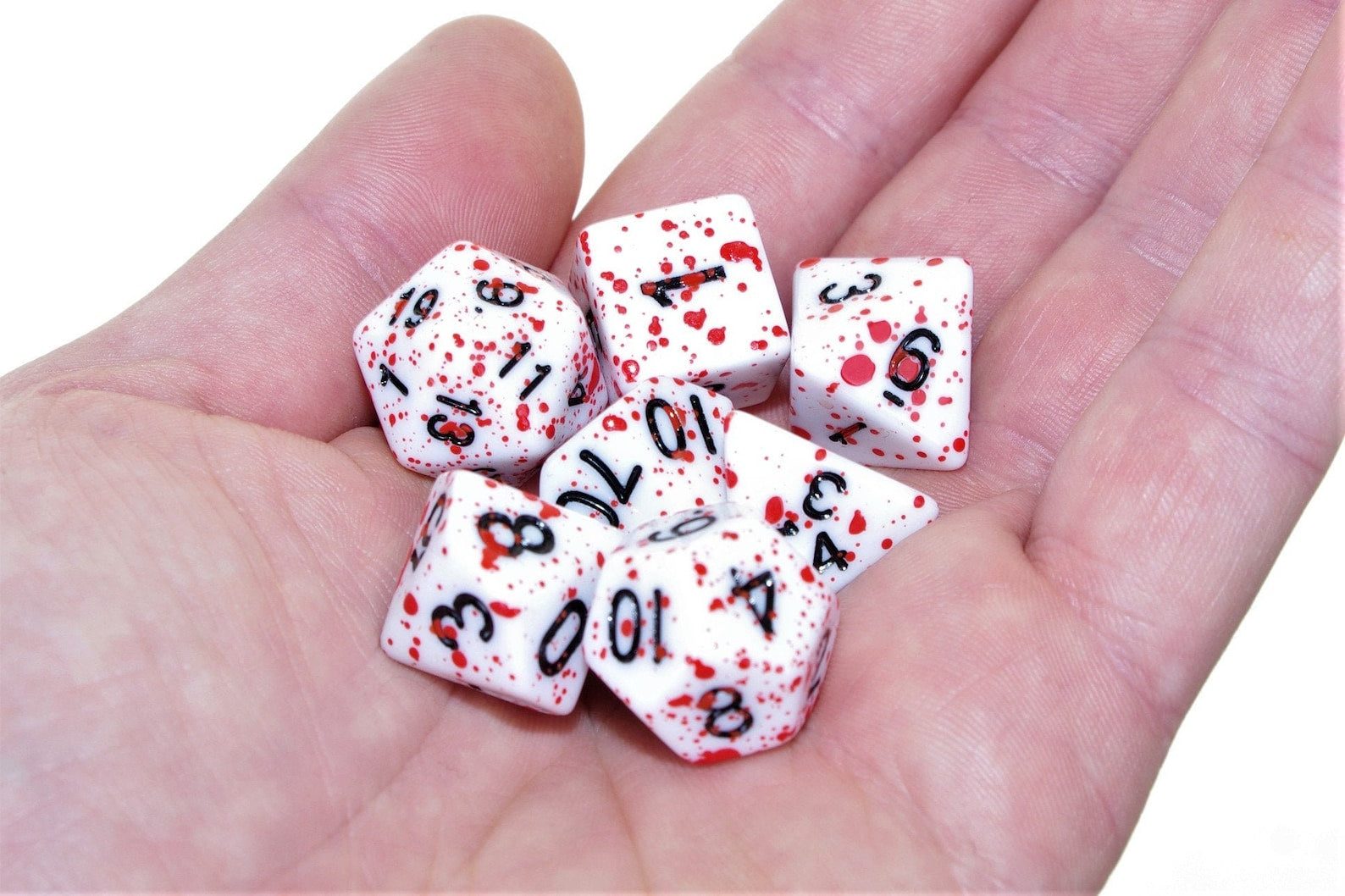 Attention, adventurers! Seeking a stellar set of D&D dice to flaunt at your next game? Look no further! Introducing Zombie Rollers, the Bloody Dice Spatter set. These dice boast a captivating textured exterior, resembling blood spatter. Get ready for an epic gaming experience with these uniquely cool dice by your side. Prepare to roll with style!